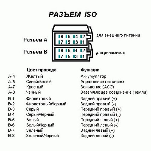 Распиновка ISO-разъема магнитолы (европейского) выглядит так: