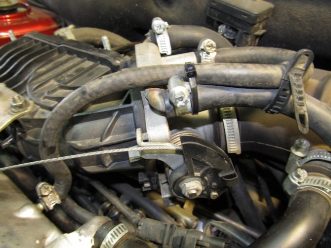 - От регулятора в моторном отсеке отключается разъем с проводом. Если автомобиль оборудован двигателем на 1,6 л, то заранее необходимо открутить два крепления дроссельного механизма к ресиверу. Затем он отодвигается от торца последнего примерно на 1 см.