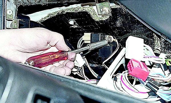 - С помощью крестовой отвертки выкрутите саморез, который крепит щиток приборов;