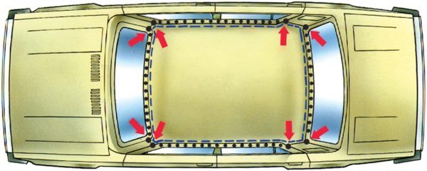 Затем крыша вырезается по периметру с отступом 8 мм от края панели. Потолок обрезается по линиям изгиба, где он соединяется с рамками лобового и заднего стекол. Резка также производится по боковым панелям.