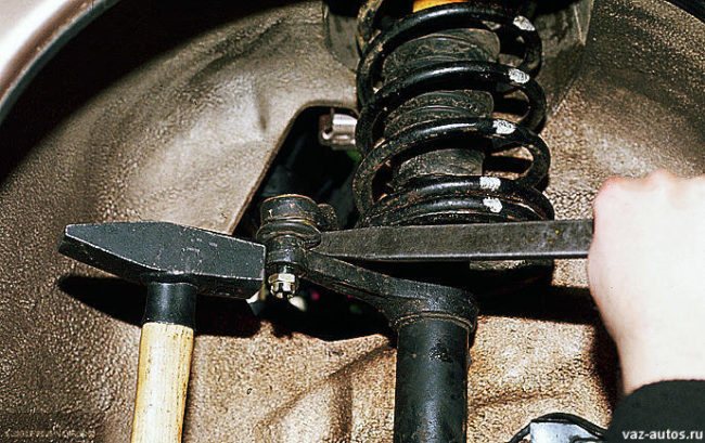 Демонтаж наконечников рулевой тяги при помощи молотка и ломика