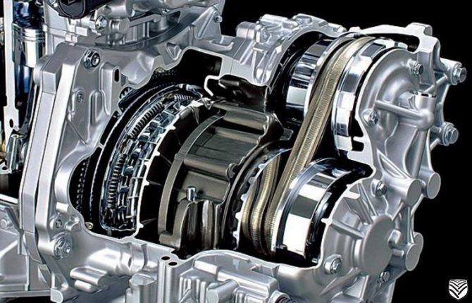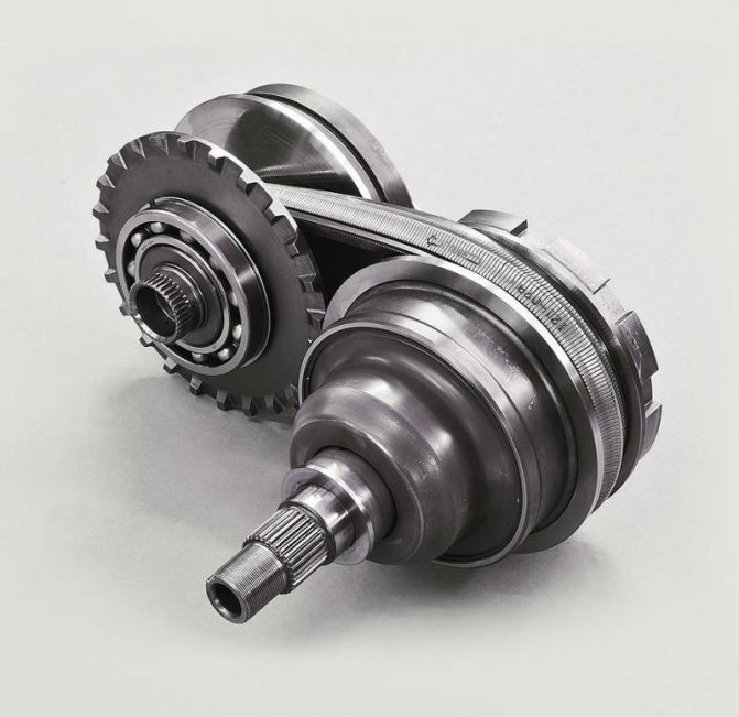 В конструкции такой коробки имеются два независимых шкива, установленных на подшипниках и оснащённых двумя конусами каждый, причём узкие стороны конусов расположены напротив друг друга. Один шкив соединён с коленчатым валом двигателя, второй шкив стоит на валу, выходящем к коробке дифференциала. Подача крутящего момента от коленчатого вала двигателя идёт через гидротрансформатор. Между шкивами установлен стальной пластинчатый ремень, с помощью которого передаётся крутящий момент. Для передачи момента на ведомый вал используется планетарная передача. Ремень может передвигаться по боковой поверхности конусов, тем самым постоянно изменяя передаточное отношение.