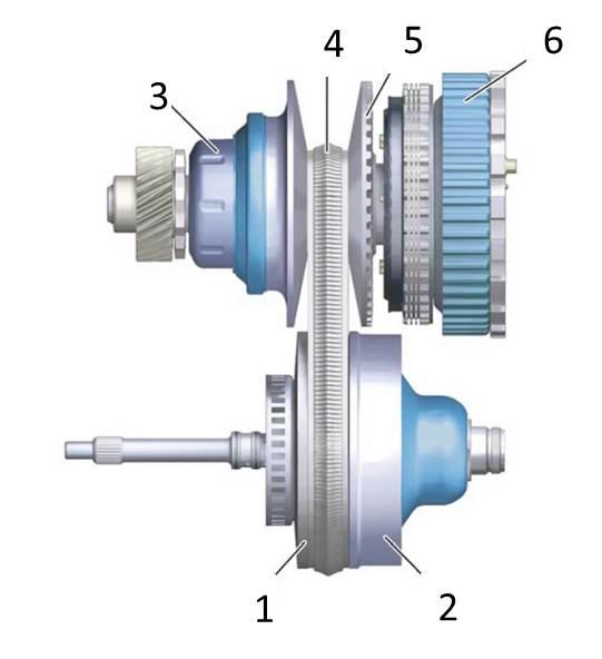 На схеме ниже показано, как работает современный вариатор. Красными стрелками обозначено направление движения крутящего момента от двигателя.