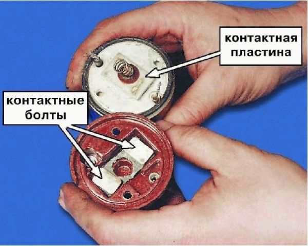 После снятия крышки вы сможете оценить состояние контактных пластин. Нагар или окисление следует удалить, воспользовавшись наждачной бумагой. Повреждённые пружины, если таковые имеются, можно попытаться заменить, подобрав подходящие по размеру и характеристикам. Подбор пружин – дело весьма сложное. Приходится замерять не только размеры, но и развиваемое усилие. Сделать это, не имея в своём распоряжении специального оборудования, не получится.