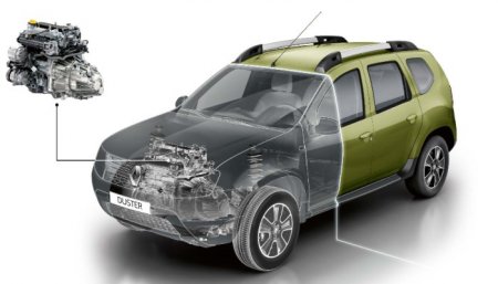 - Duster с передним приводом, оснащенный бензиновым двигателем на 2,0 литра и механической шестиступенчатой трансмиссией;