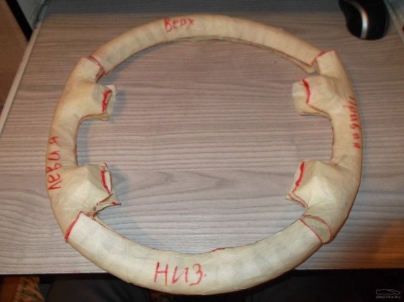 Для того, чтобы правильно перетянуть руль, и чтобы результат вашей работы имел эффектный вид, необходимо сделать выкройку. Для этого нужно сделать предварительный макет (шаблон).