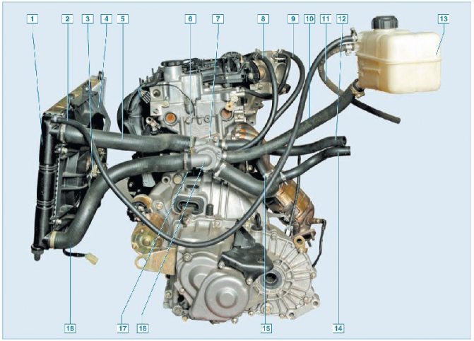 : 1 — радиатор системы охлаждения; 2 — пароотводящий шланг; 3 — электровентилятор; 4 — кожух вентилятора; 5 — подводящий шланг радиатора; 6 — датчик температуры охлаждающей жидкости системы управления двигателем; 7 — корпус термостата; 8 — шланг подвода жидкости к блоку подогрева дроссельного узла; 9 — шланг отвода жидкости от блока подогрева дроссельного узла; 10 — наливной шланг; 11 — пароотводящий шланг радиатора отопителя; 12 — подводящий шланг радиатора отопителя; 13 — расширительный бачок; 14 — отводящий шланг радиатора отопителя; 15 — труба насоса охлаждающей жидкости; 16 — крышка термостата; 17 — датчик указателя температуры охлаждающей жидкости; 18 — отводящий шланг радиатора