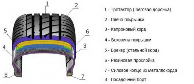 Конструкция шины достаточно сложная и состоит из множества элементов: корда, протектора, брекера, плечевой зоны, боковины и борта. Поговорим о них подробнее.