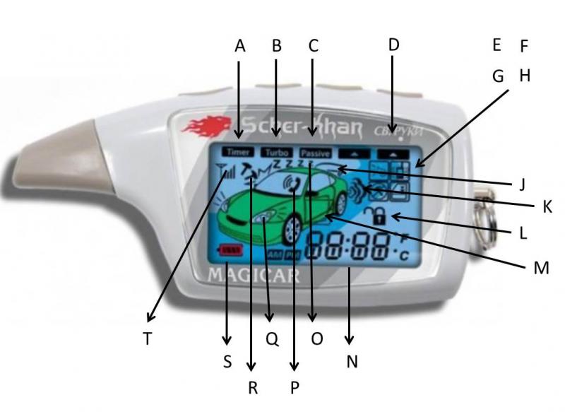 пуск по таймеру (А); режим турботаймера (B); пассивное включение системы (C); режим автоматического включения без нажатия на кнопки (D); включенная сирена (E); выключен датчик определения ударов (F); активен вибровызов в брелоке (G); управление замками дверей после запуска зажигания (H); открытая крышка багажника (J); включен в режиме автозапуска двигатель (K); состояние системы (L); открытые двери (M); поле для отображения часов, температуры и данных при автозапуске (N); режим работы Valet (O); работающая аварийная сигнализация или невыключенные габариты (P); срабатывания датчика удара (Q); индикатор батареи брелока (R); уровень сигнала (S).