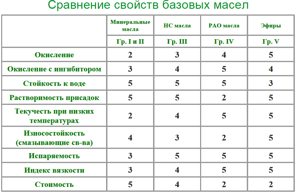 Многолетний опыт в производстве автомобильных масел показывает, что наилучшие характеристики имеют смеси ПАО с полиэфирами (эфирами). Однако значительным недостатком таких продуктов является их высокая стоимость. В качестве более доступной альтернативы дорогим смазкам можно рассмотреть моторное масло, синтезированное из сырой нефти с использованием глубокой очистки и катализаторов гидрокрекинга.