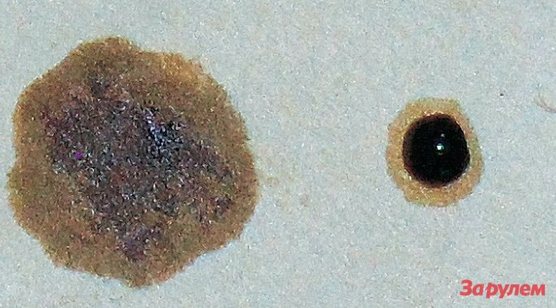 Пример капельной пробы. Слева — капля использованного, но еще пригодного масла, которая расползлась в большую кляксу. Справа — масло, требующее замены: его капля не желает никуда расползаться.