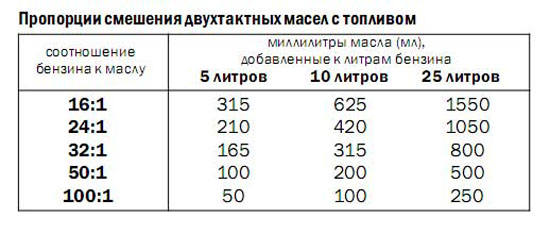 | Соотношение (масло:бензин) | Применение | Как приготовить 1 литр смеси |