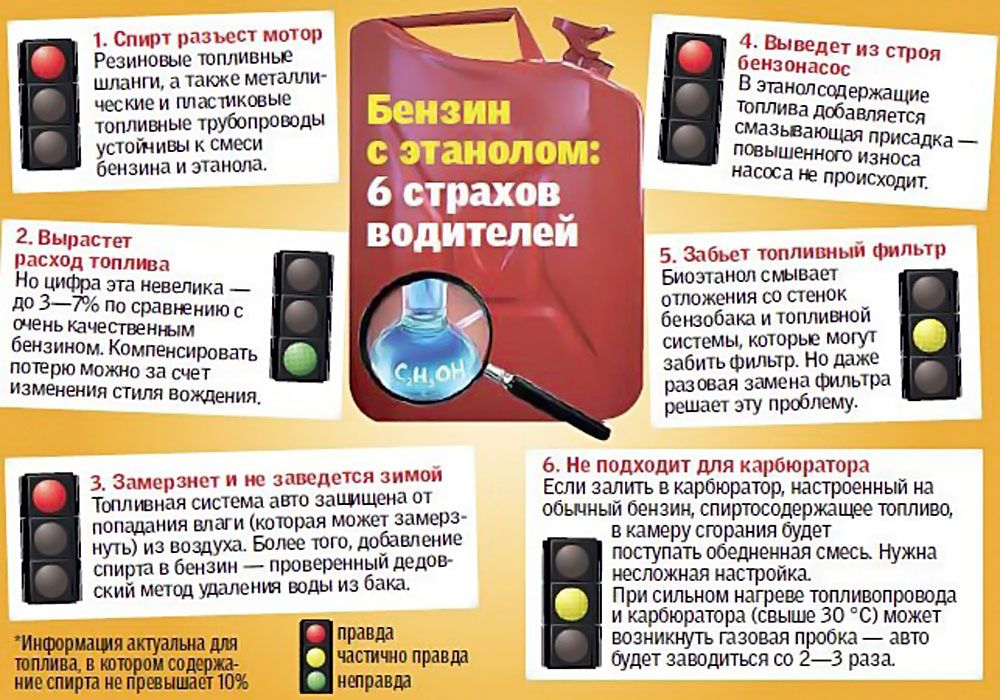 Во время езды шум двигателя значительно меньше, что, конечно же, не так сильно раздражает водителя. Отрицательные аспекты наличия спирта в бензине: в старых автомобилях его крайне не рекомендуется использовать, ибо двигатель, как и топливная система, не предназначен для бензина с содержанием спирта.