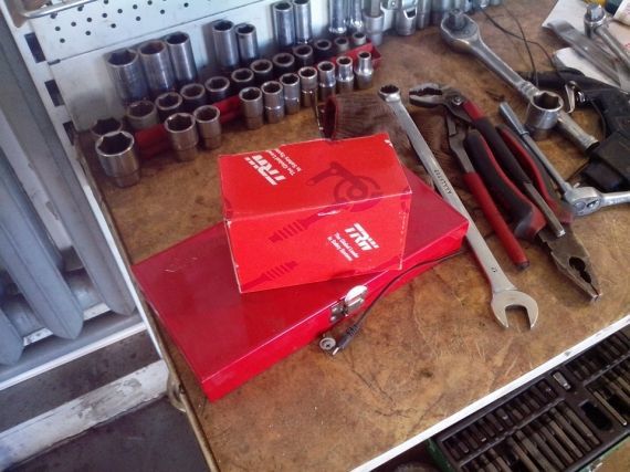 - Установите автомобиль на яму, включив передачу вместо ручного тормоза, затем спуститесь в яму, захватив с собой монтировку, большую отвертку и набор ключей.