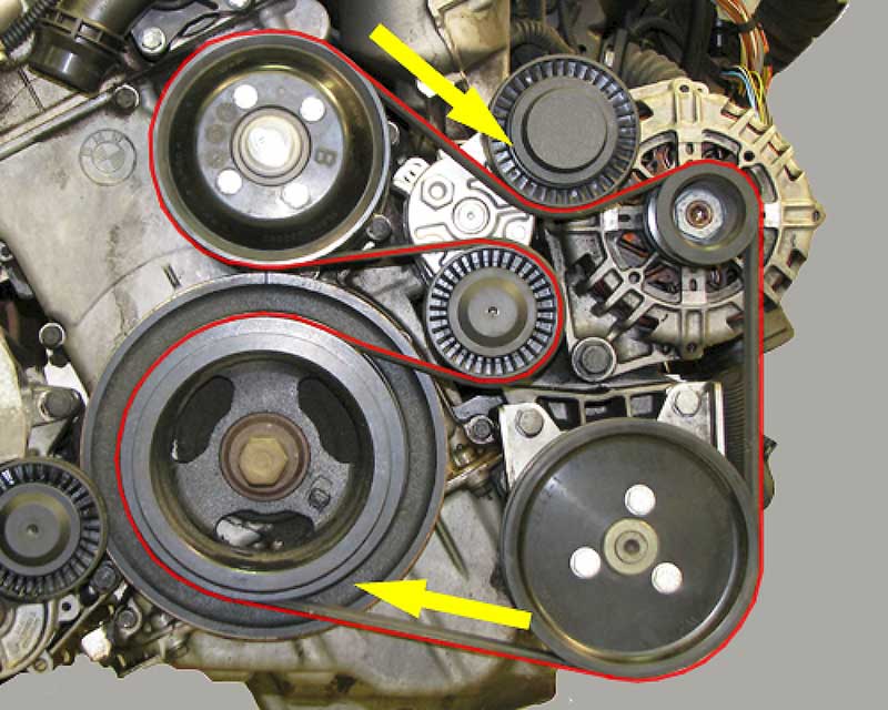Пример сложного расположения ремня для нескольких агрегатов Ремень можно привести в порядок своими силами. Проверьте ремень на предмет наличия трещин и потертостей, посмотрите, не слабо ли он затянут. Если ремень поврежден, замените его. Шкив также можете заменить, если у вас есть запасной и вы чувствуете, что в состоянии справиться с этой задачей.