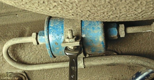 - Когда фильтр ничего не держит, отведите от него все подводящие трубки топливопровода и ослабьте хомут крепления корпуса, воспользовавшись ключом на «10».