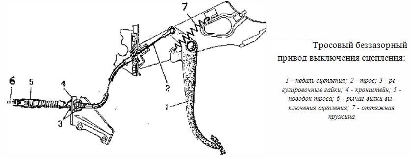Одна его сторона фиксируется к педали, а другая соединяется с вилкой выключения через кронштейн, используя механизм для настройки положения педали сцепления.