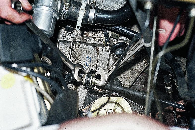 На коробке передач расположен кронштейн крепления, из которого необходимо извлечь трос. Для этого понадобятся два ключа на «19», с помощью которых ослабляют фиксирующие гайки тросика. После этого натяжение ослабляется, и трос легко вынимается из крепления.