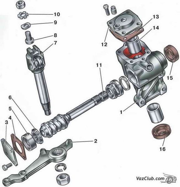 1 — картер; 2 — сошка; 3 — нижняя крышка картера; 4 — регулировочные прокладки; 5 — наружное кольцо подшипника вала червяка; 6 — сепаратор с шариками; 7 — вал сошки; 8 — регулировочный винт; 9 — регулировочная пластина; 10 — стопорная шайба; 11 — вал червяка; 12 — верхняя крышка картера; 13 — уплотнительная прокладка; 14 — втулка вала сошки; 15 — сальник вала червяка; 16 — сальник вала сошки.