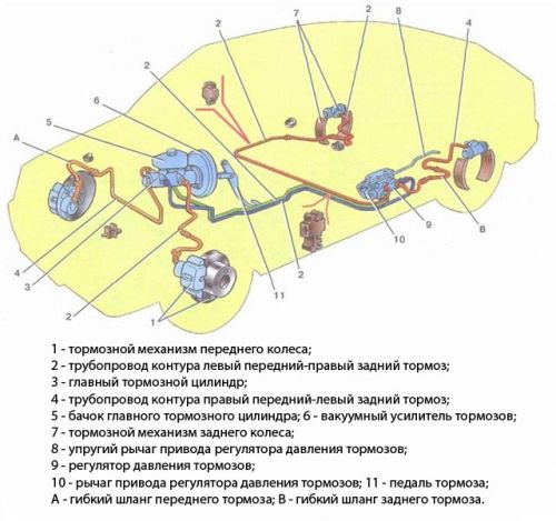 Тормозной привод автомобиля ВАЗ-2109 реализован в классическом исполнении, основанном на двухконтурной гидравлической системе. Конструкция привода включает в себя: