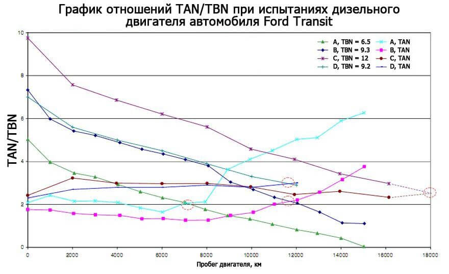 Перед тем как определить, через сколько моточасов следует менять масло в дизельном двигателе, важно учесть один нюанс. Можно ли использовать масла с низким щелочным числом (TBN) в странах с некачественным топливом, например, в России, где содержание серы высоко? В процессе работы двигателя и масла щелочное число уменьшается, а кислотное — увеличивается. Это позволяет предположить, что пересечение графиков этих показателей при определенном пробеге указывает на то, что масло исчерпало свой ресурс, и дальнейшая его эксплуатация может повредить двигатель. Мы представляем графики испытаний четырех типов масел с различными значениями кислотных и щелочных чисел. Для эксперимента были выбраны четыре масла с условными названиями:
