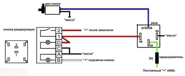 Мотор подключается через предохранитель и реле, рассчитанное на 10 Ампер. Управление реле осуществляется с помощью кнопки, установленной на приборной панели.