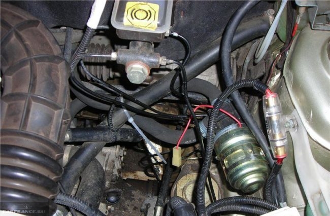 Питание «+» берется непосредственно от аккумулятора, но это допустимо, так как на проводе установлен герметичный держатель с предохранителем (5А). Процесс установки кнопки довольно прост: