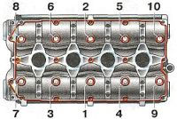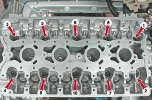 Головка цилиндров является общей для четырех цилиндров и изготовлена из алюминиевого сплава. Она крепится к блоку с помощью десяти болтов и центрируется двумя втулками. Для обеспечения равномерного и плотного прилегания головки к блоку, болты необходимо затягивать на холодном двигателе в установленной последовательности.