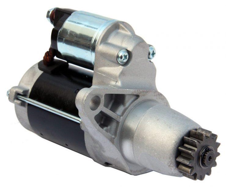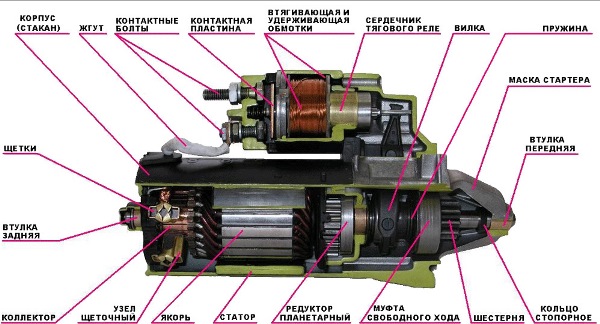 Стартер представляет собой силовой электродвигатель, который функционирует на основе постоянного напряжения. Он дополнительно оборудован втягивающим реле, обгонной муфтой и бендиксом — шестеренкой, обеспечивающей соединение стартера с маховиком.