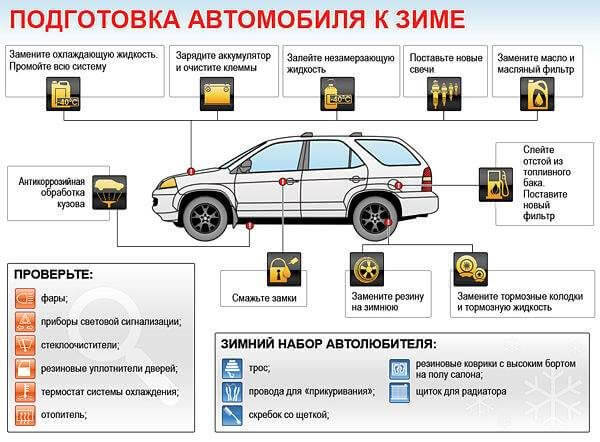 | Кузов и оптика | Обработать кузов антикоррозийным составом | Защита от реагентов и соли, которые используются зимой. |