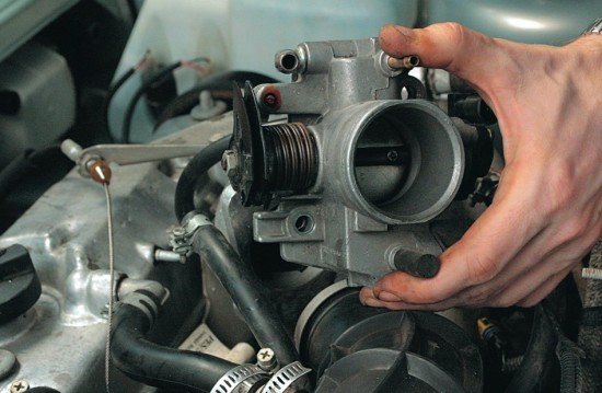 Узел дроссельной заслонки проверяется с помощью визуального осмотра на наличие загрязнений. Для очистки детали используют ватные палочки и зубную щетку, предварительно смоченные в чистящем растворе. Для удобства работы рекомендуется снять устройство. После завершения чистки желательно продуть все каналы и патрубки узла сжатым воздухом, используя насос для подкачки шин.