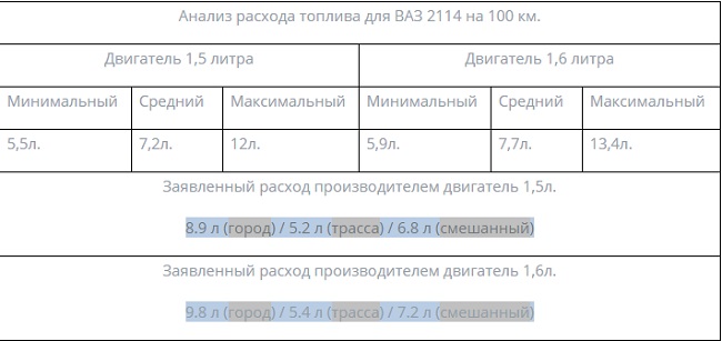 Таким образом, количество бензина, расходуемого на расстоянии в 100 км, является показателем топливной эффективности вашего автомобиля, на который влияют технические характеристики двигателя. Наиболее популярные инжекторы для модели «ВАЗ 2114» – это 1.5 (78 л. с.) и 1.6 (81 л. с.) литровые двигатели. Расход топлива у этих моделей отличается незначительно, что можно увидеть на фото. Также стоит отметить, что двигатель может быть как с 16, так и с 8 клапанами, но это не влияет на рассматриваемый вопрос. Как и у других автомобилей, минимальный расход топлива «четырнадцатая» показывает на трассе. При соблюдении скорости в диапазоне 70-90 км/ч можно достичь уровня, характерного для маломощных автомобилей – 5 литров. Что касается городских условий, то здесь все зависит от вашего стиля вождения. Опытный водитель в условиях мегаполиса не потратит более 10 литров на те же 100 километров, тогда как в других случаях расход может возрасти до 13-14 литров, как у «Волги». На фото представлены заявленные средние, максимальные и минимальные уровни расхода для обоих типов двигателей. Интересно, что реальный расход топлива мало чем отличается от заводских данных.