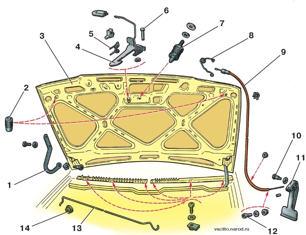 Детали капота и замка: 1 – петля капота; 2 – буфера; 3 – капот; 4 – крючок; 5 – пружина крючка; 6 – ось крючка; 7 – штырь; 8 – пружина замка; 9 – оболочка с тягой замка; 10 – ось рукоятки; 11 – рукоятка замка; 12 – втулка оболочки тяги; 13 – оболочка с тягой замка; 14 – втулка упора капота.