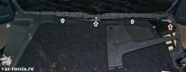 Замки расположены в верхней части и по краям спинки (один из замков обозначен красной стрелкой, другой, к сожалению, на фото не виден). Кроме того, в центральной части находится ручка (указана синей стрелкой), которая управляет обоими замками. Она соединена с ними с помощью тяги, выполненной из металлического троса (тяга, то есть сам трос, обозначена зелёной стрелкой). Если вам нужно откинуть спинку сиденья, сначала переведите фиксатор в крайнее положение, что позволит тросу вытянуть держатель тяги, и в результате спинка заднего сиденья сможет откинуться.