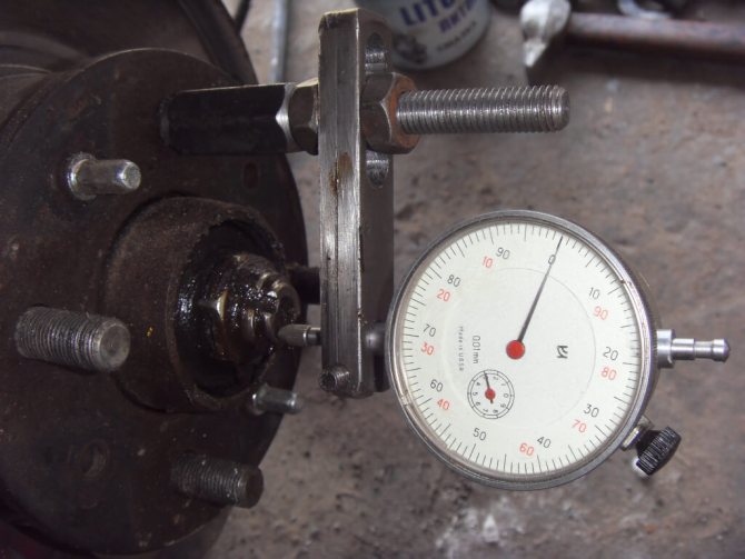 Допустимое отклонение стрелки от нулевого значения не должно превышать 0,038 мм. Если отклонение больше — возможно, что проблема в ступице.