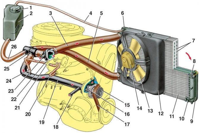 Охлаждённая жидкость быстро забирает лишнее тепло и удаляет его принудительным обдувом. Такая циркуляция продолжается до того момента, пока автомобильный мотор продолжает функционировать.
