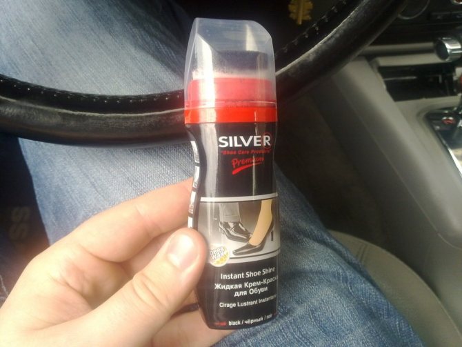 Некоторые владельцы авто пользуются краской для обуви. Но такая краска не устойчива и только скрывает потертости. Она не пригодна для качественной реставрации, пачкается и оставляет следы на руках.