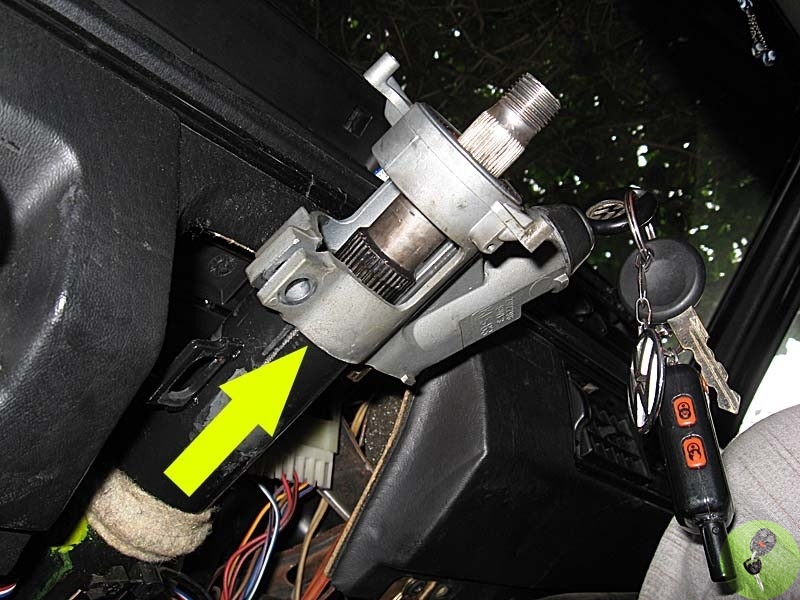 Чтобы избежать заклинивания рулевого колеса, необходимо демонтировать неисправный замок из его посадочного места. Для этого вам понадобятся несколько отверток с плоским и крестообразным лезвием. В первую очередь следует снять пластиковый кожух рулевой колонки и отсоединить проводку. Замок фиксируется винтами, которые также нужно выкрутить. Затем с помощью тонкой плоской отвертки нужно утопить фиксатор и извлечь устройство наружу.