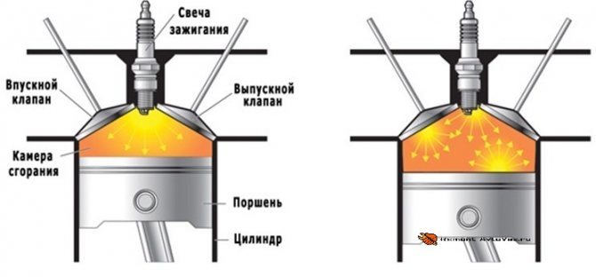 Слева – нормальное сгорание; справа – детонационное сгорание