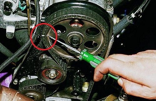 Когда метки на верхней и нижней шестернях будут правильно выставлены, можно приступать к откручиванию натяжного ролика, а затем снимать ролик и ремень ГРМ.