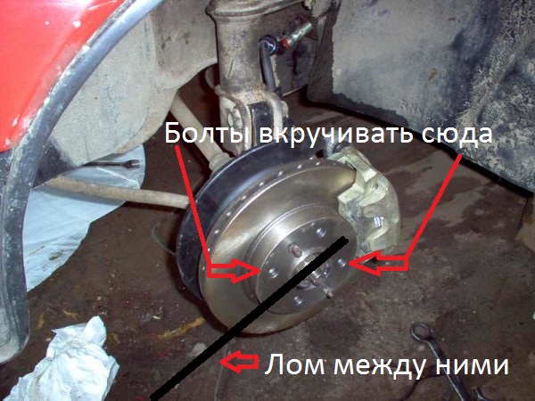 Если у вас есть помощник, попросите его, не снимая машину с пятой передачи, нажать на тормоза изо всех сил. В это время возьмите головку и длинный рычаг, и с усилием прокручивайте болт против часовой стрелки.