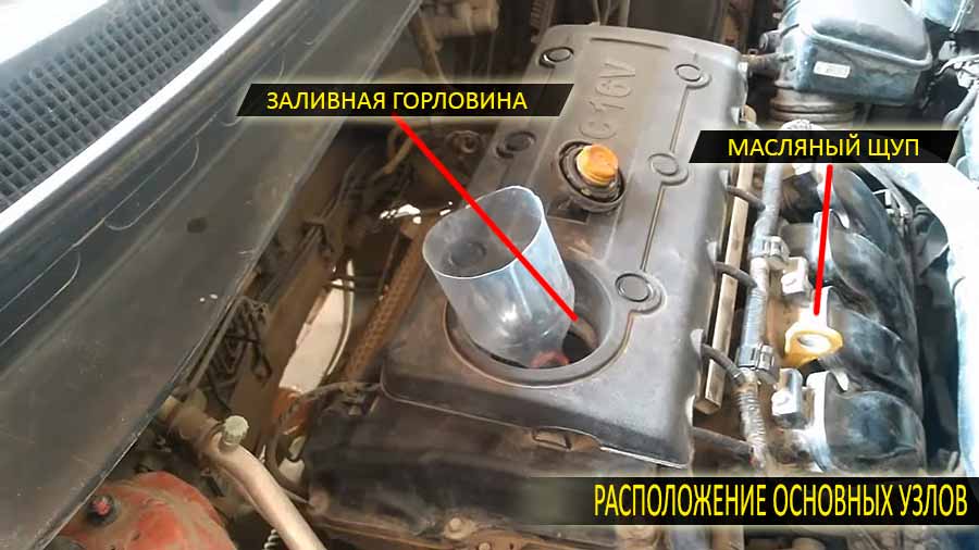 Откручиваем пробку заливной горловины и вынимаем масляный щуп. Масло будет сливаться быстрее, если есть сквозное отверстие.