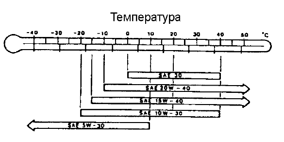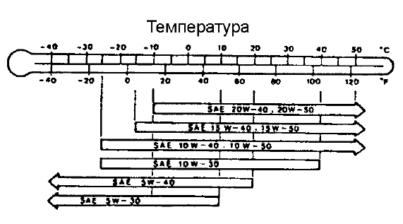Анализируя схему 3, можно легко выяснить, что при очень низких температурах зимой рекомендуется применять масла SAE 5w-30 или 5w-40. В условиях ограниченных температур от -25°C до +40°C подойдет смазка 10w-30. При температуре выше -25°C можно использовать 10w-40 или 10w-50, а при температуре от -15°C и выше — масла 15w-40 или 15w-50. Для регионов с температурой воздуха от -10°C и выше рекомендуется заливать 20w-40 или 20w-50.