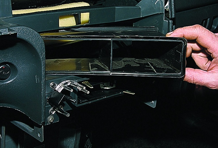 Откройте бардачок, выкрутите шесть саморезов, крепящих его, и извлеките его.