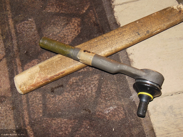 Теперь можно выпрессовать наконечник из его посадочного места на стойке. Для этого используйте специальный съемник или монтировку с молотком.