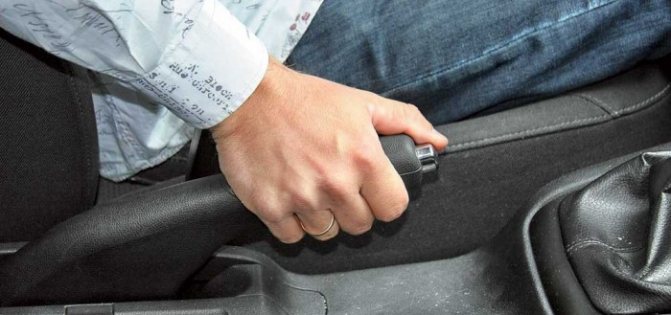 - Включите на коробке передач первую скорость и поставьте машину на ручник, потянув рычаг вверх.