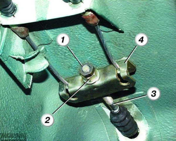 - металлической тяги со шпилькой на конце и коромыслом, направляющим трос. Эта деталь жестко крепится к рычагу и расположена под днищем машины. По сути, это и есть устройство крепления троса. При необходимости натянуть его достаточно ослабить крепление троса к тяге, вытянуть его на требуемую длину и снова закрепить;